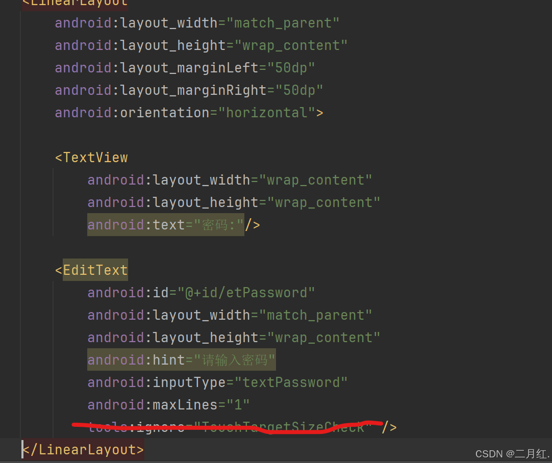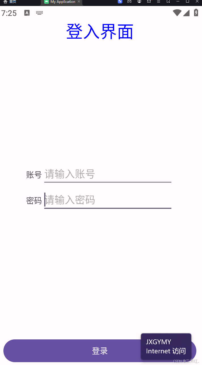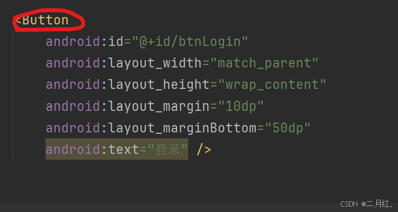 ′登录页面′:和以上不同的是,登录,需要一个按钮【Button】因为我们后续需要这个按钮有相关 作用,不是文本输入TextView哦