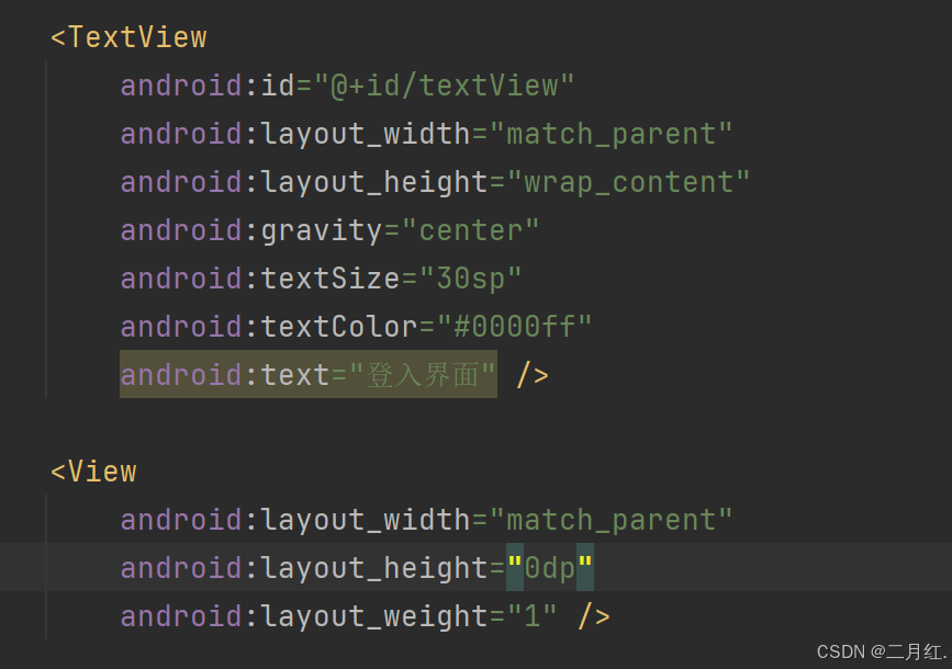 “登入页面”代码如下:添加一个TextView,(gravity)位置 (textSize)字体大小【单位是sp】 (textColor)字体颜色