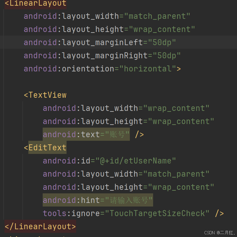 “账号、密码输入”:我们需要再添加一个线性布局,排列方向为水平。在子布局中添加一个TextView显示‘账号’;接着再添加一个EditText用于账号输入(同理添加显示密码和密码输入),使用android:hint设置文字提示。接着在线性布局上添加属性android:layout_marginLeft/Right 设置左右边距。别忘啦还有个占位View!