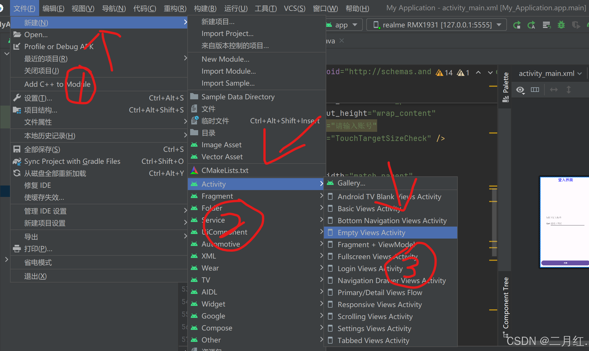 根据以上3个步骤,先点击【文件】(选中新建)-----【Activity】------【Empty Views Activity】(根据需要选择不同的Activity)