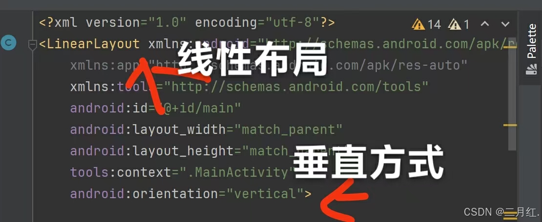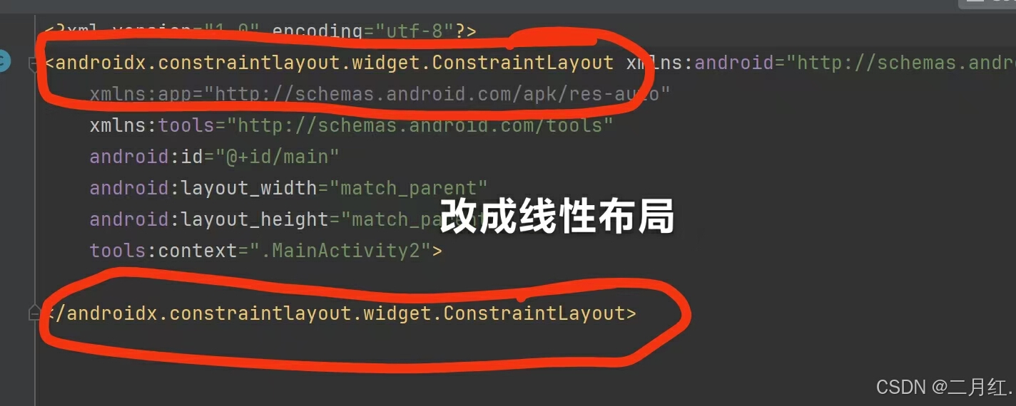 第二步:改成线性布局【LinearLayout】(:其内的控件按照线性进行排列),排列方式有两种:1.水平方式(horizontal) 2.垂直方式(vertical),登入页面总体布局方式为垂直方式