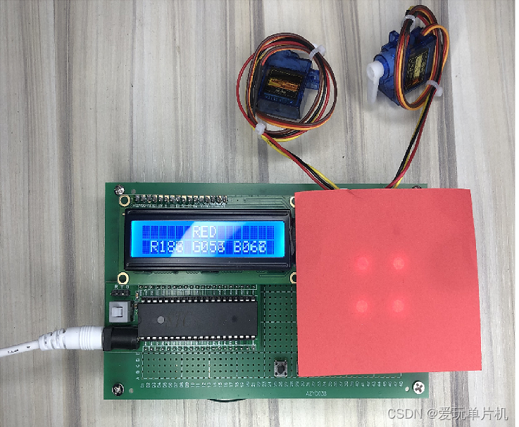 1.可以识别颜色,并且在LCD1602上面显示R G B对应的值。