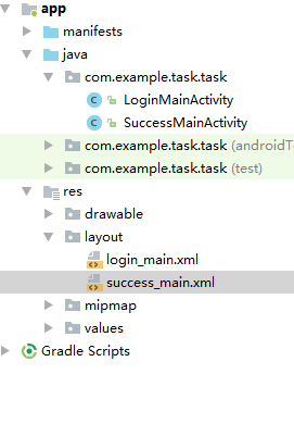 打开Android studio,你需要建立两个类LoginMainAcitivity.java和SuccessMainActivity.java,和与之相对应的xml布局文件login_main.xml和success_main.xml存放于layout文件中。见例图:
